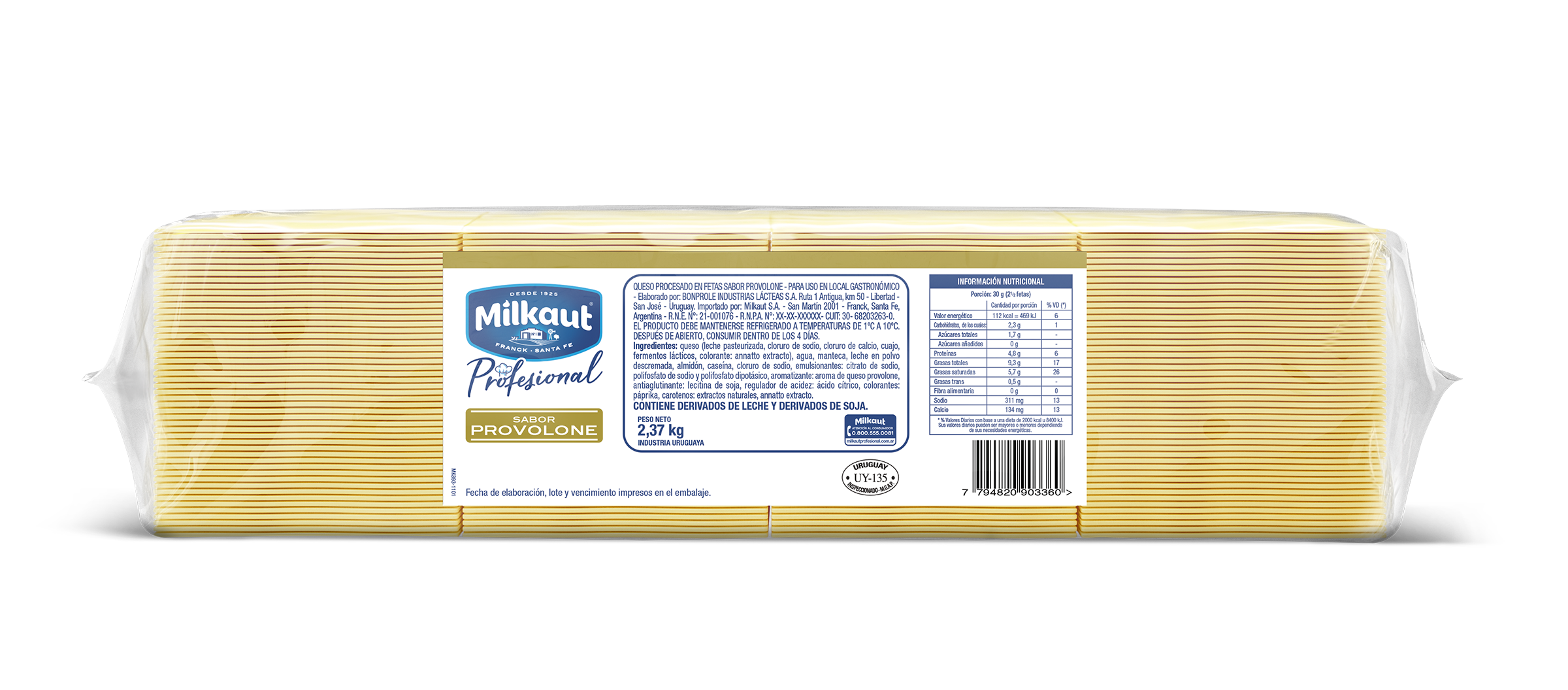 La barra de Queso Provolone Laminado Milkaut Profesional ofrece 192 unidades apiladas, fáciles de separar y manipular, regulares y listas para usar. La practicidad del formato se fusiona con el sabor característico del Provolone madurado, ligeramente afrutado y de textura fundente, ideal para darle más intensidad a tus recetas.